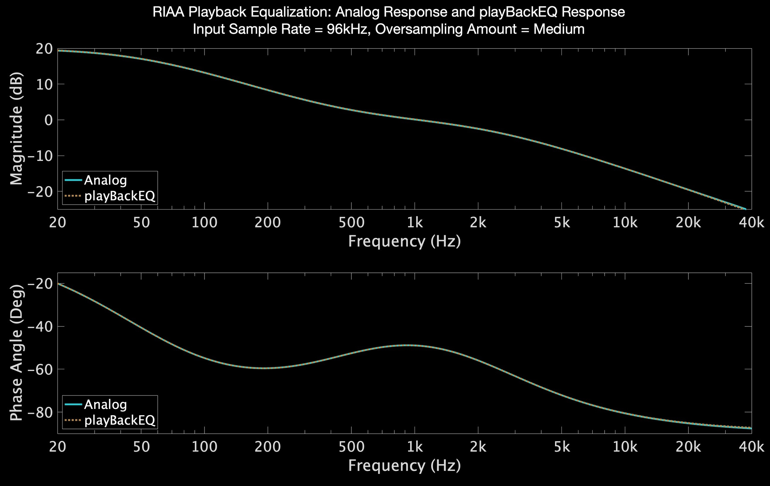 playBackEQ starts with the equations that define each curve in the analog domain and uses the bilinear transform and oversampling to adapt them to the digital domain. The upshot is playback curves that are the true complement of their analog cutting curve counterparts. The amount of oversampling can be chosen by the user to suit available computational power and amplitude and phase error requirements. As an example, at a base sample rate of 48kHz, with amount of oversampling set to ‘medium’, the RIAA playback curve is accurate to within 0.078dB from 20Hz to 20kHz. For comparison, the McIntosh C12000 preamplifier (street price, $19,000) is spec’ed to within 0.5dB over the same bandwidth.